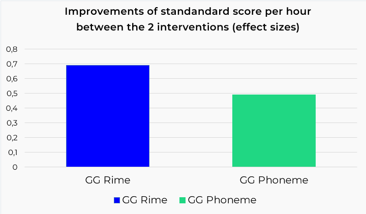 - The study found that 11 hours of exposure to GG Rime over a 12-week period resulted in substantial gains in literacy skills. Specifically, medium to large improvements were observed in reading (34–38%) and spelling (40–45%), while phonological awareness and nonword reading showed even greater gains (50–60%).